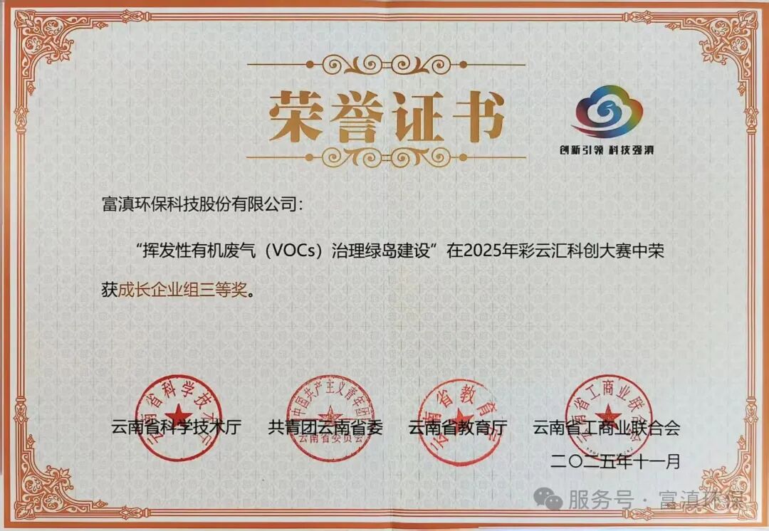 捷报传来,荣誉加冕!在刚落幕的2025年云南省“彩云汇”科创大赛决赛中,富滇环保科技股份有限公司(以下简称“富滇环保”)凭借其创新项目——“挥发性有机废气(VOCs)治理绿岛建设-汽修业喷烤漆VOCs集中治理新模式”荣获“三等奖”。